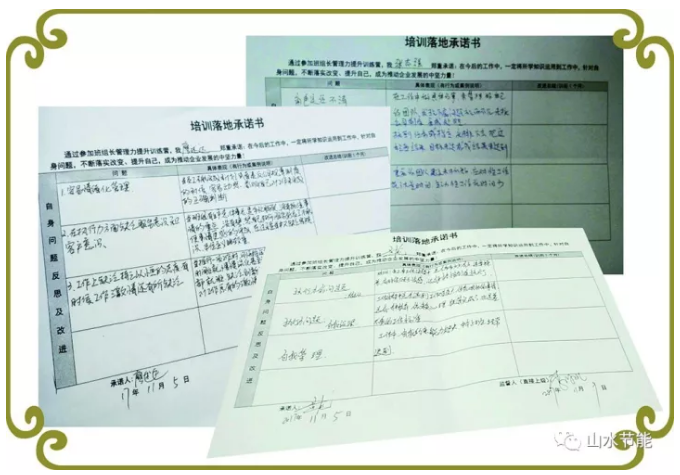培訓(xùn)回司后,我們的班組長(zhǎng)把培訓(xùn)成果進(jìn)行總結(jié),學(xué)到的知識(shí)運(yùn)用到工作中,并制定改進(jìn)計(jì)劃形成落地承諾書(shū)交直接上級(jí)簽字,亮出山水全新風(fēng)貌!